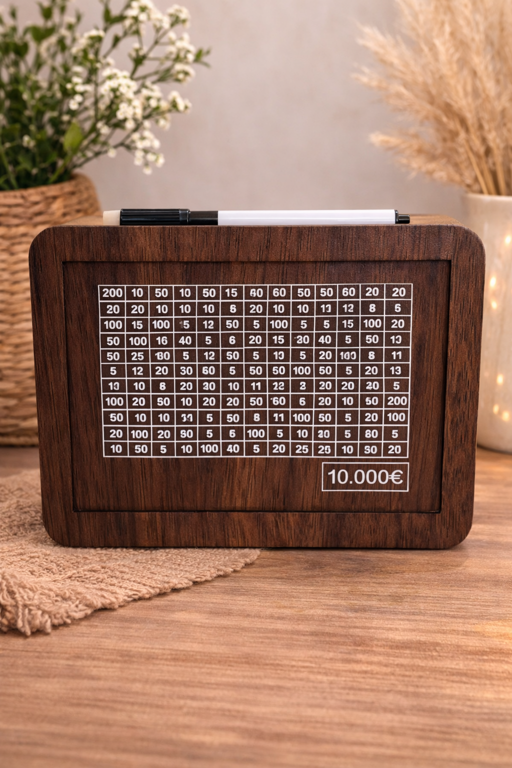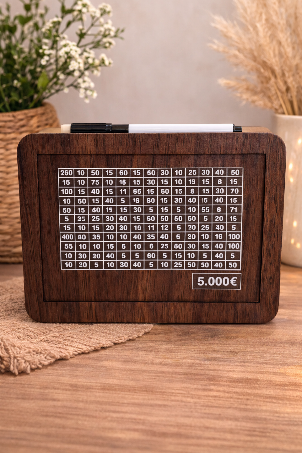 Savršena za sve koji žele razviti naviku uštede na praktičan, ali i estetski privlačan način. Izrađena od kvalitetnog drveta, ova kasica dolazi u tri različite veličine. Pružajući fleksibilnost u izboru prema vašim potrebama i ciljevima štednje. Svaka verzija ima ugrađen slot za ubacivanje novčića ili novčanica. Uz dodatnu motivaciju u obliku jasno vidljivih oznaka koje sugeriraju različite vrijednosti ušteđenog novca.