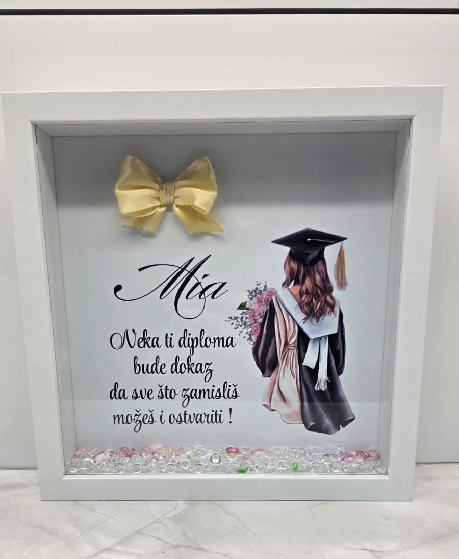 Ovaj okvir za diplomu personaliziran je imenom i porukom po želji, što ga čini nezaboravnim i posebnim. Unutar okvira nalazi se motiv diplomantice u svečanoj odori s kapicom i buketom cvijeća, dok dodatni ukrasi poput mašnice i staklenih perlica stvaraju dojam luksuza i topline. Svaki detalj pažljivo je odabran kako bi okvir poklon izgledao profinjeno i svečano.
