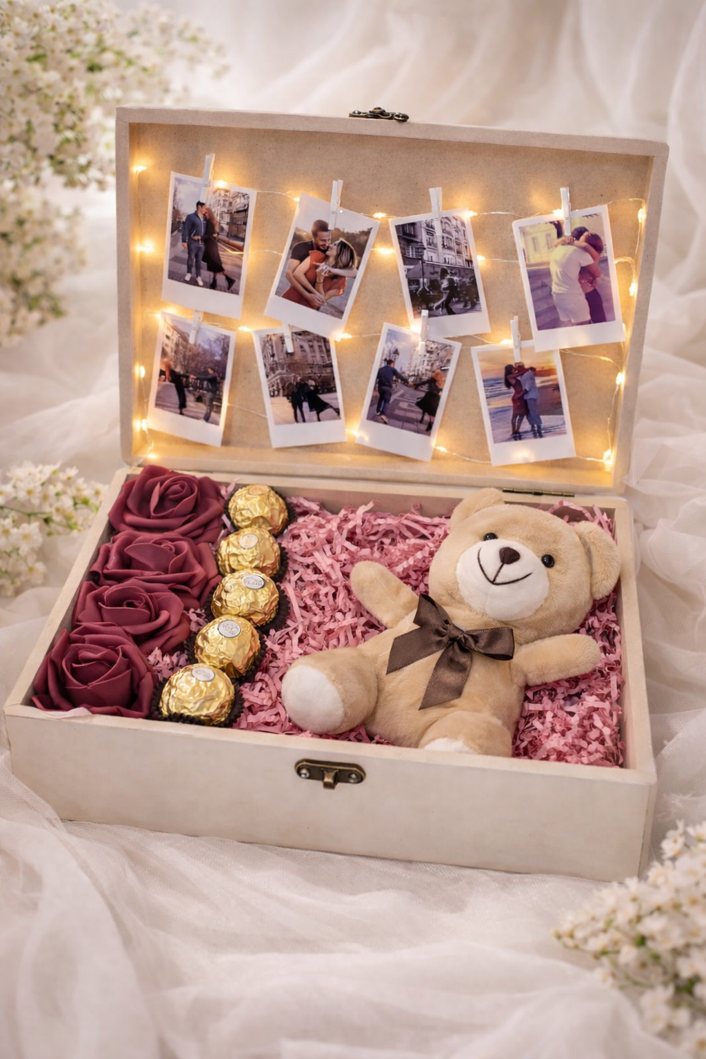 Ova poklon kutija je savršena kao romantično iznenađenje, ali i kao uspomena koja ostaje dugo nakon što se slatkiši pojedu. Fotografije i rasvjeta ostaju kao dekoracija i podsjetnik na najljepše trenutke.