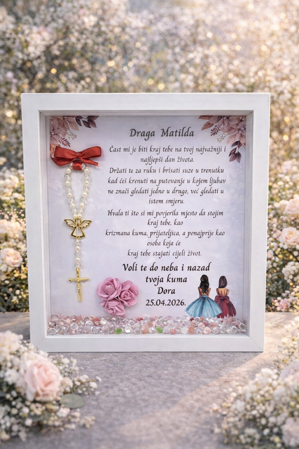 Personalizirani poklon okvir je savršen izbor za posebne prigode poput krštenja, pričesti i krizme. Dimenzija 23 cm x 23 cm s debljinom okvira od približno 4 cm, ovaj okvir će očarati svojom elegancijom. U personalizirani poklon okvir možete dodati natpis s vlastitim tekstom, sliku i malu krunicu, pružajući personalizirani i jedinstveni dodir. Izrađena od kvalitetnog ekrila, krunica ima mogućnost graviranja željene poukice. Dostupan je u verzijama za djevojčice s roza detaljima i dječake s plavim detaljima. Ovaj personalizirani okvir će biti dragocjen podsjetnik na važne trenutke.